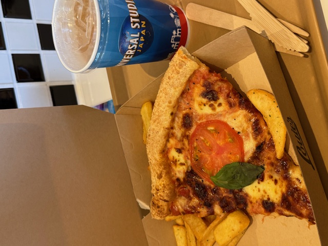 お昼ごはんには、とあるスタッフの顔くらいあるサイズのピザを豪快にパクリ!