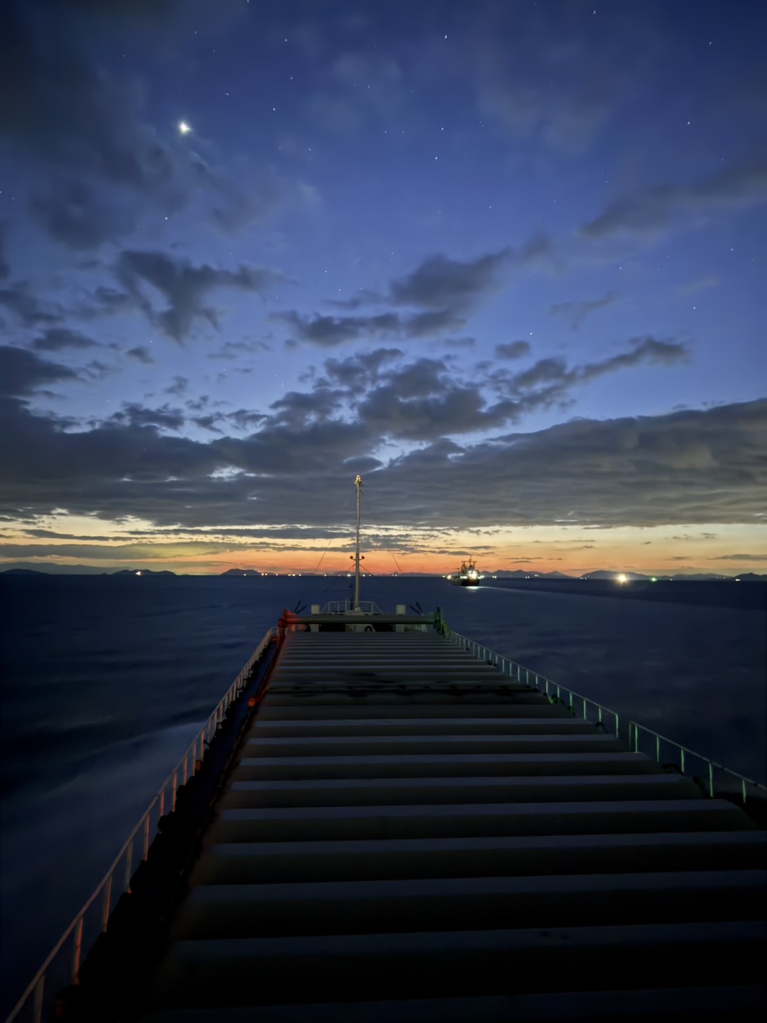 早朝の静けさの中で、この素晴らしい景色を目の当たりにしながらも、船員さんたちは常に私たちの安全と円滑な運航を守るために努力を続けています