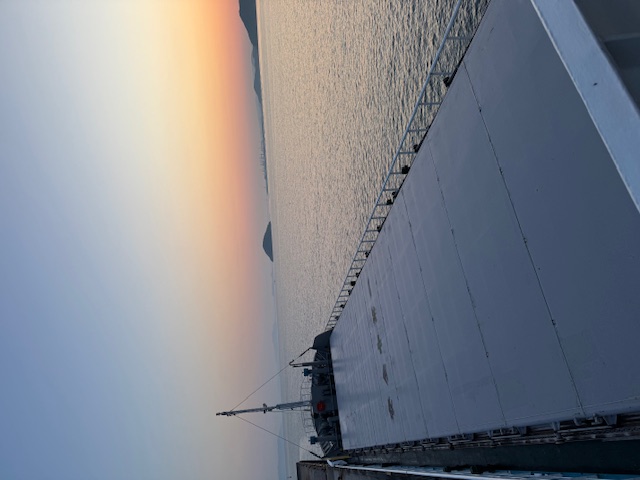 朝のまだ静けさが残る時間、船体は朝日を浴びてキラリと光り、どこか誇らしげな佇まい。
