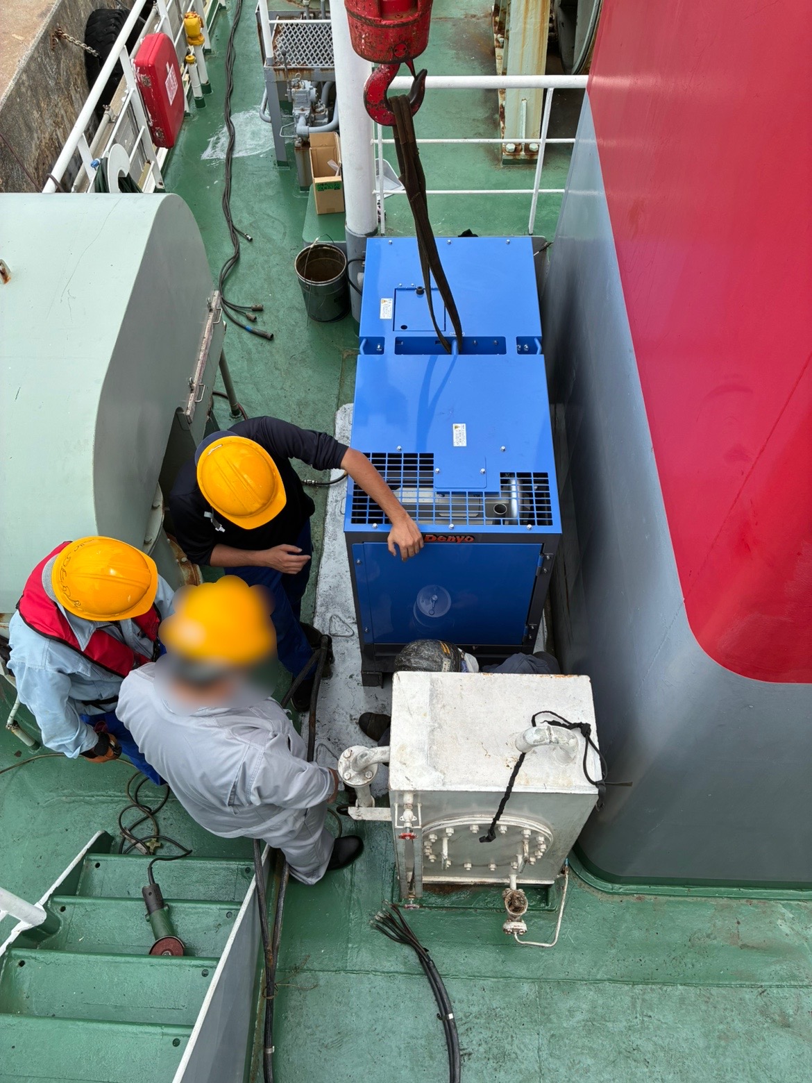 今回は、老朽化した発電機の取り替え作業ということで、業者さん、乗組員さん、そして管理側である弊社スタッフが連携して作業にあたりました